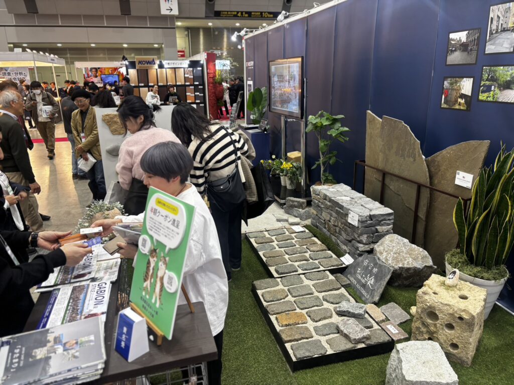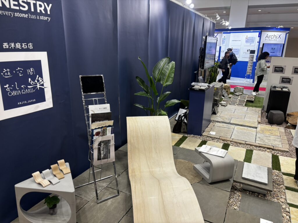 おしゃ楽さんのブースでは、インド砂岩の新しい敷石や、砂岩のガーデンファニチャーなどの展示。