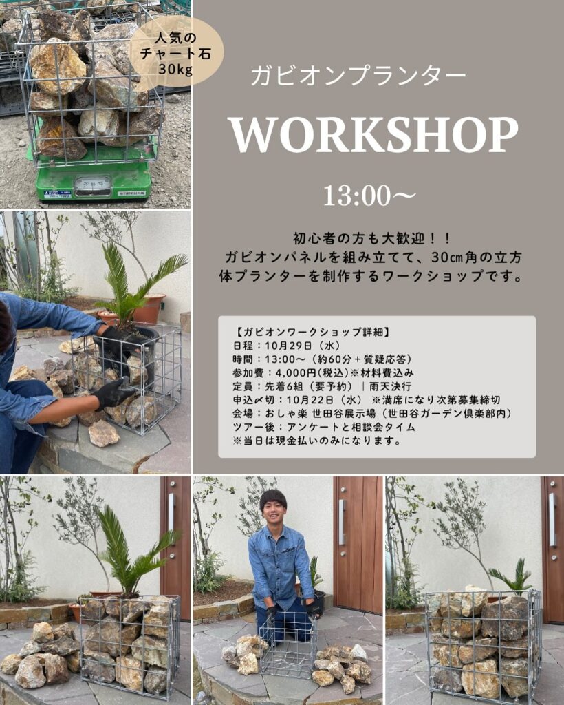 愛知に本社を構える「西洋庭石店 おしゃ楽」主催で、人気の「GABIONワークショップ」と月一恒例「ガーデンツアー」を、同日に開催いたします。